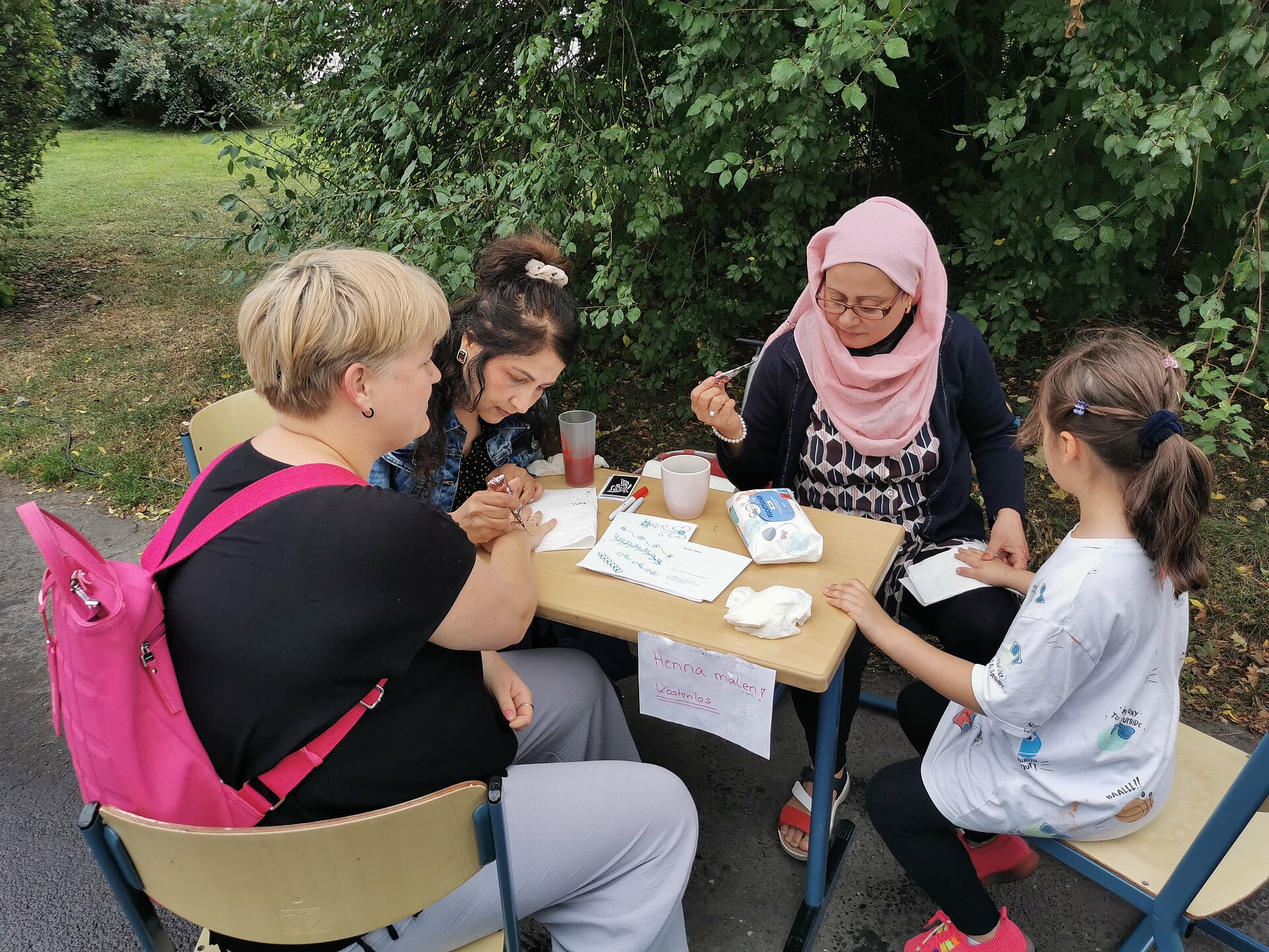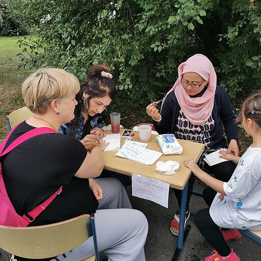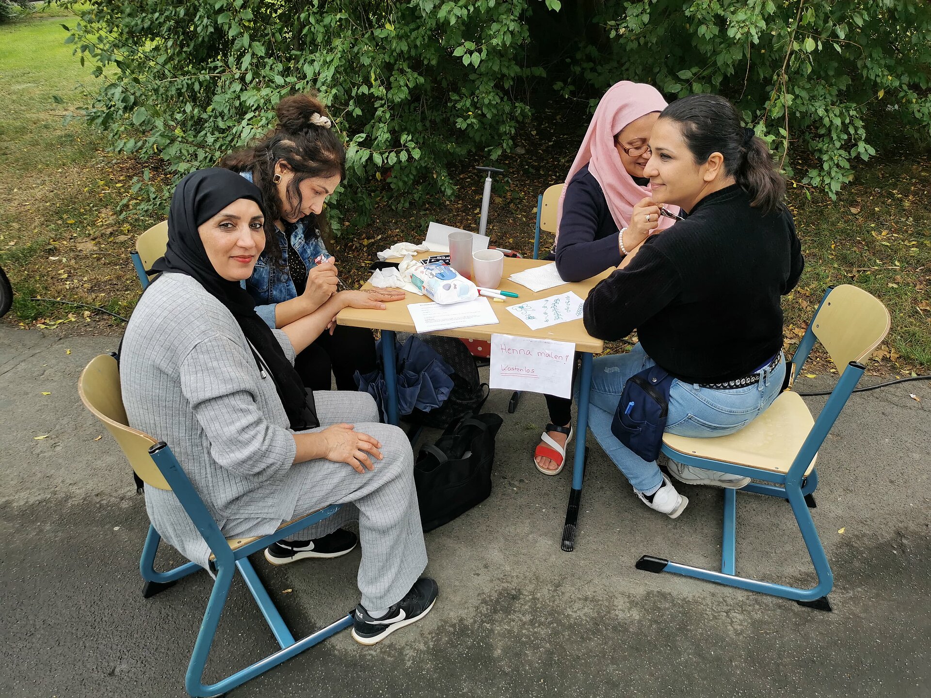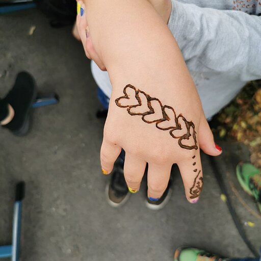 Am 21.09.2023 fand im Rahmen der Mobilitätswoche an der Grundschule Waldau ein Fest mit Temporärer Spielstraße statt. Neben vielen anderen Stadtteilakteuren hat sich das Projekt „Frauen gestalten Waldau“ mit einer Henna-Tattoo-Aktion für Klein und Groß beteiligt. Die Aktion, an der 5 Frauen aktiv beteiligt waren, wurde sehr gut angenommen.